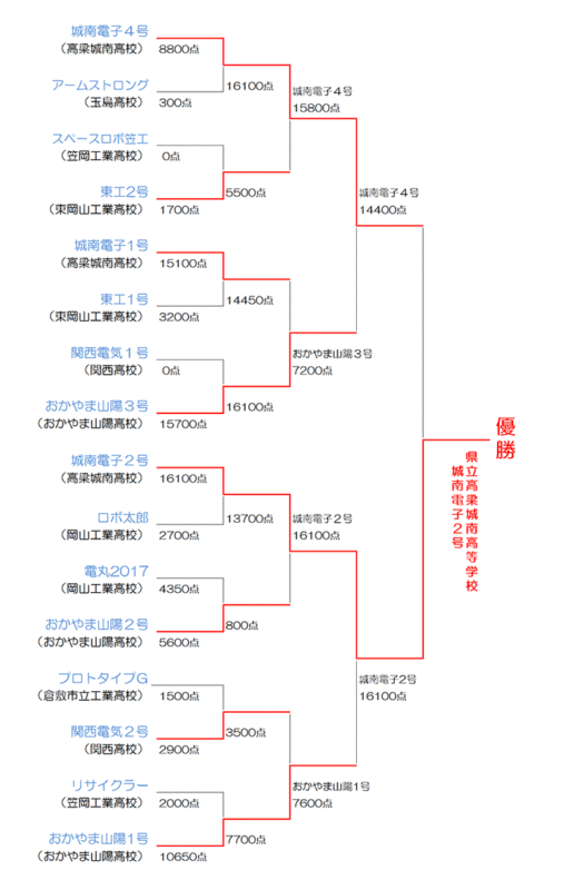 優勝の里庄中学校「月光」号チーム、高梁城南高等学校「城南電子2号」チームの皆さん、おめでとうございます。すばらしいロボットの構想、設計、製作、操縦であり、日頃の努力の賜物と思います。また、惜しくも準優勝のチームをはじめとして、予選で力を出し切れなかったチームの皆さんもよく頑張ったと思います。出場した皆さんは、この大会への取組で様々な経験をしたと思います。皆さんがヒーローです。